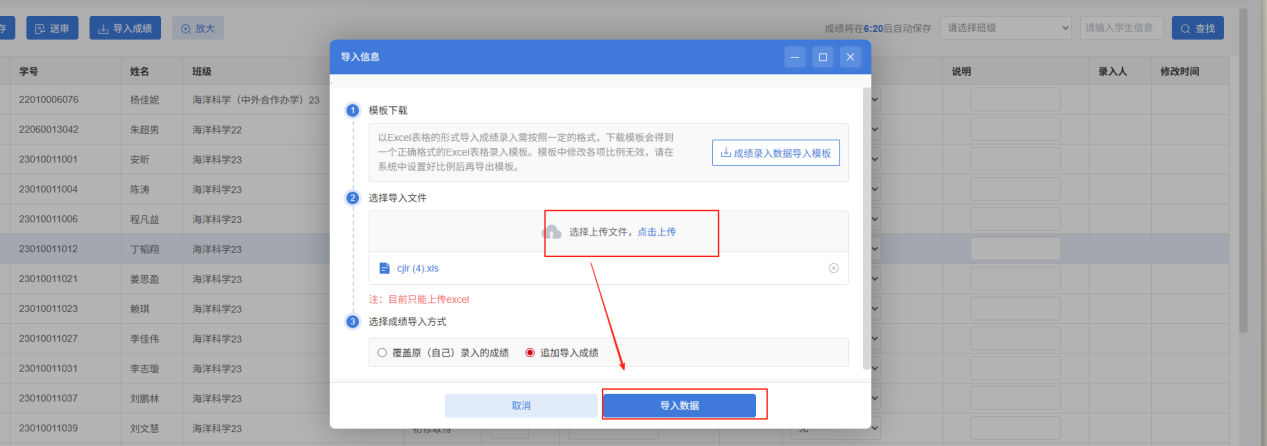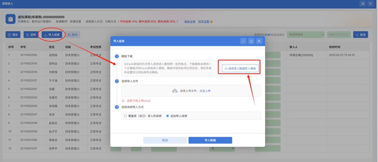 方法二:导入成绩。点击“导入成绩”→点击“成绩录入数据导入模板”下载→点击浏览器下载图标进行模板查看→在模板内填入各项成绩→上传导入文件,点击导入→点击“保存”或“送审”(无需审核,默认直接通过)。