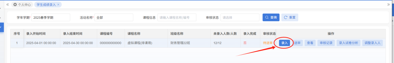 步骤二:选择“学年学期”(选择实际录入的学年学期)→点击“查询”→选中需要录入成绩的数据→点击“录入”。