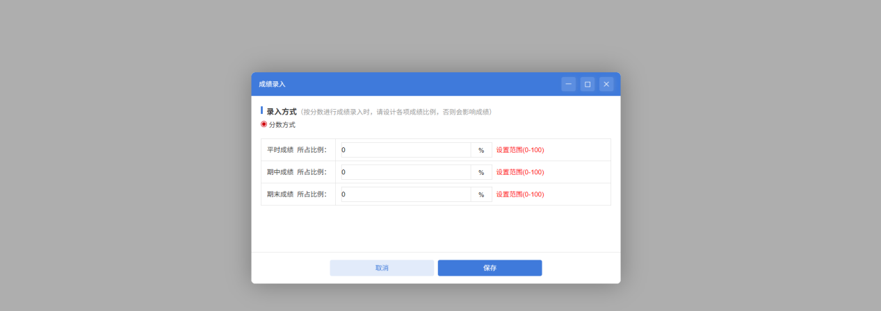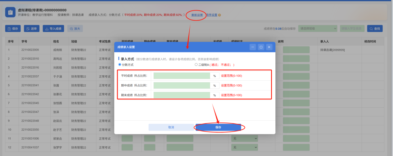 点击“重新设置”→设置对应的各项成绩比例→点击“保存”。