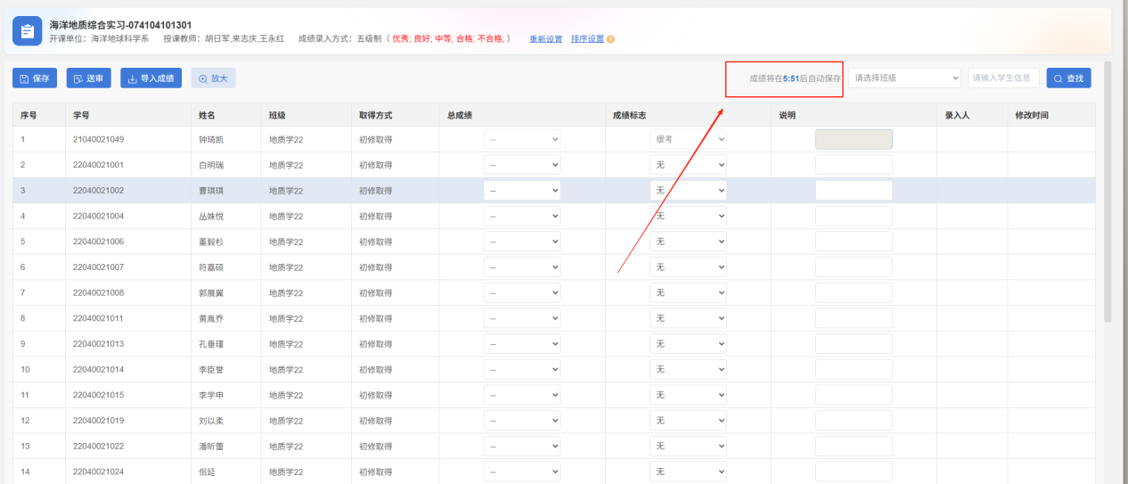 2、自动保存机制。录入成绩界面的右上角会有一个自动保存成绩的倒计时,到时间会自动保存一次成绩。