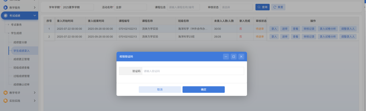 步骤三:进入验证界面,输入验证码(目前暂由学院教秘提供),验证无误即可设置各项成绩比例(已设置过各项成绩比例的可直接进入成绩录入界面)。